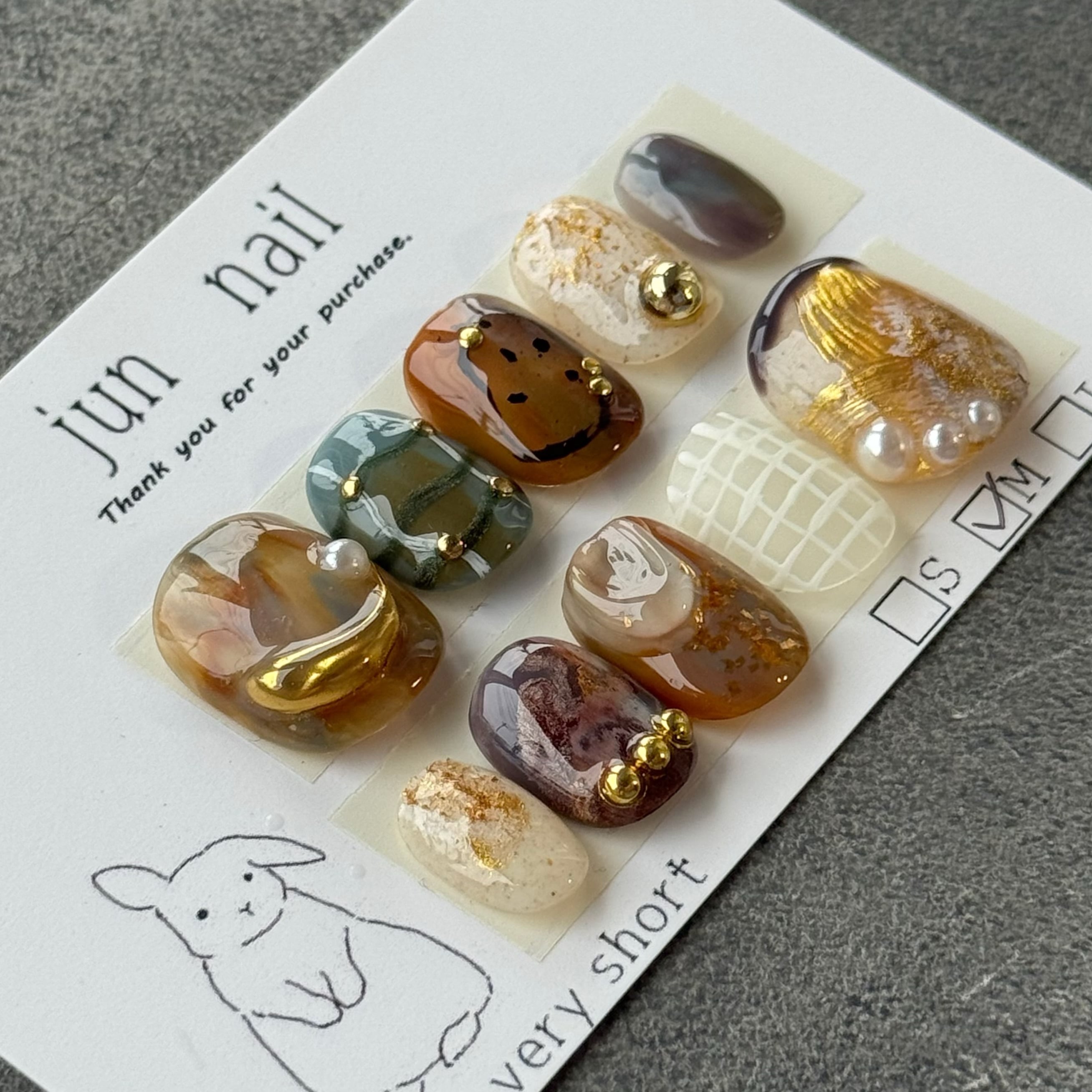 ◼️標準的なサイズをご希望の方◼️ ①商品ページのオプション「●標準的なサイズで購入したい方●」を選択。 ② オプションを追加する場合は追加して購入して下さい。 ------------------------------------------------ ◼️サイズを測ってオーダーする場合◼️ ※こちらのページの画像を確認して下さい ①チップの形を決める。 ②自分の爪の横幅を測る。 ③サイズ表を見ながら親指から小指まで 0〜9番のチップを選んでメモる。 ④商品ページのオプション「●サイズオーダーしたい方●」を選択してサイズを親指から記入する。 (例 ベリーショート13237) (例 ショートオーバル右26569左27568) ⑤オプションを追加する場合は追加して購入して下さい。 ------------------------------------------------ 《オプション一覧》 ・お急ぎ便(優先的に作成)¥300 ・最優先+速達¥800 ・ネイルチップ用接着テープ6回分¥300 ・ネイルチップ用接着テープ10回分¥500 ・イニシャル1文字¥100 ゴールドorシルバー、入れる位置の入力をお願いします。 (例 シルバーM、右薬指下) ・トップコート二重(強度アップ)¥200 ・ラッピング箱入り¥500